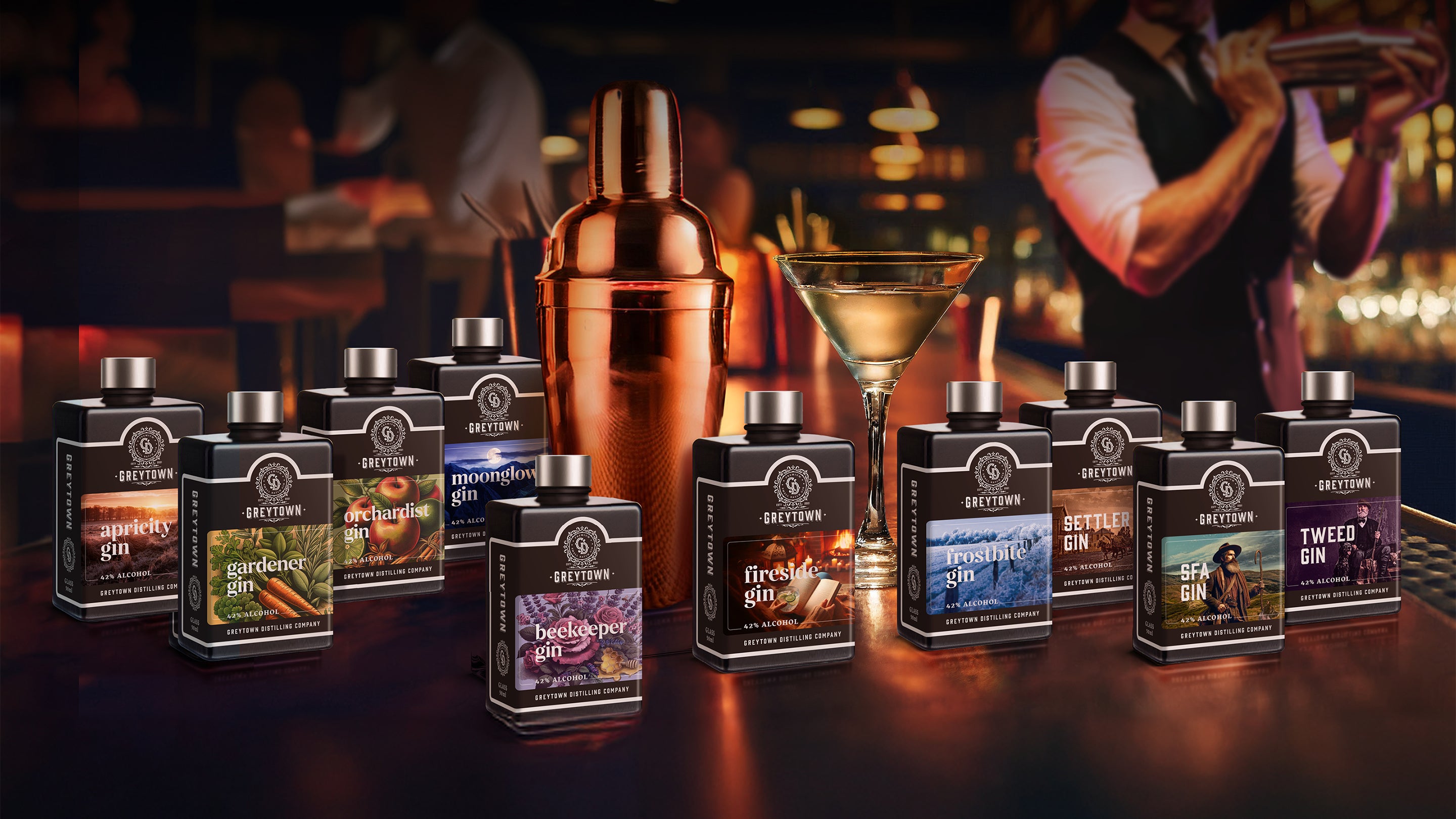 MINI BAR is our fastest selling product ever, and features 10 beautiful black glass bottles containing the complete range of our most awarded and biggest selling gins including Tweed, SFA, Settler, Frostbite, Moonglow, Fireside, Apricity, Orchardist, Beekeeper and Gardener. Your MINI BAR comes complete with a cocktail recipe guide and other surprises inside.