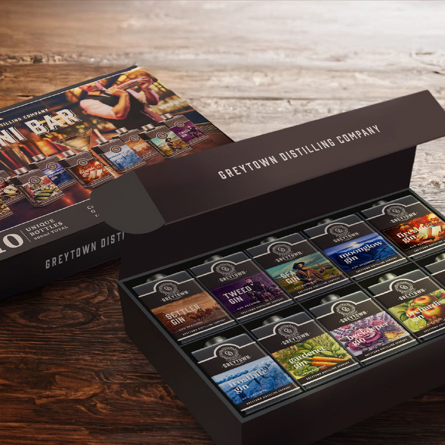 MINI BAR is our fastest selling product ever, and features 10 beautiful black glass bottles containing the complete range of our most awarded and best-selling gins including Tweed, SFA, Settler, Frostbite, Moonglow, Fireside, Apricity, Orchardist, Beekeeper and Gardener. Your MINI BAR comes complete with a gin cocktail recipe guide and other surprises inside.